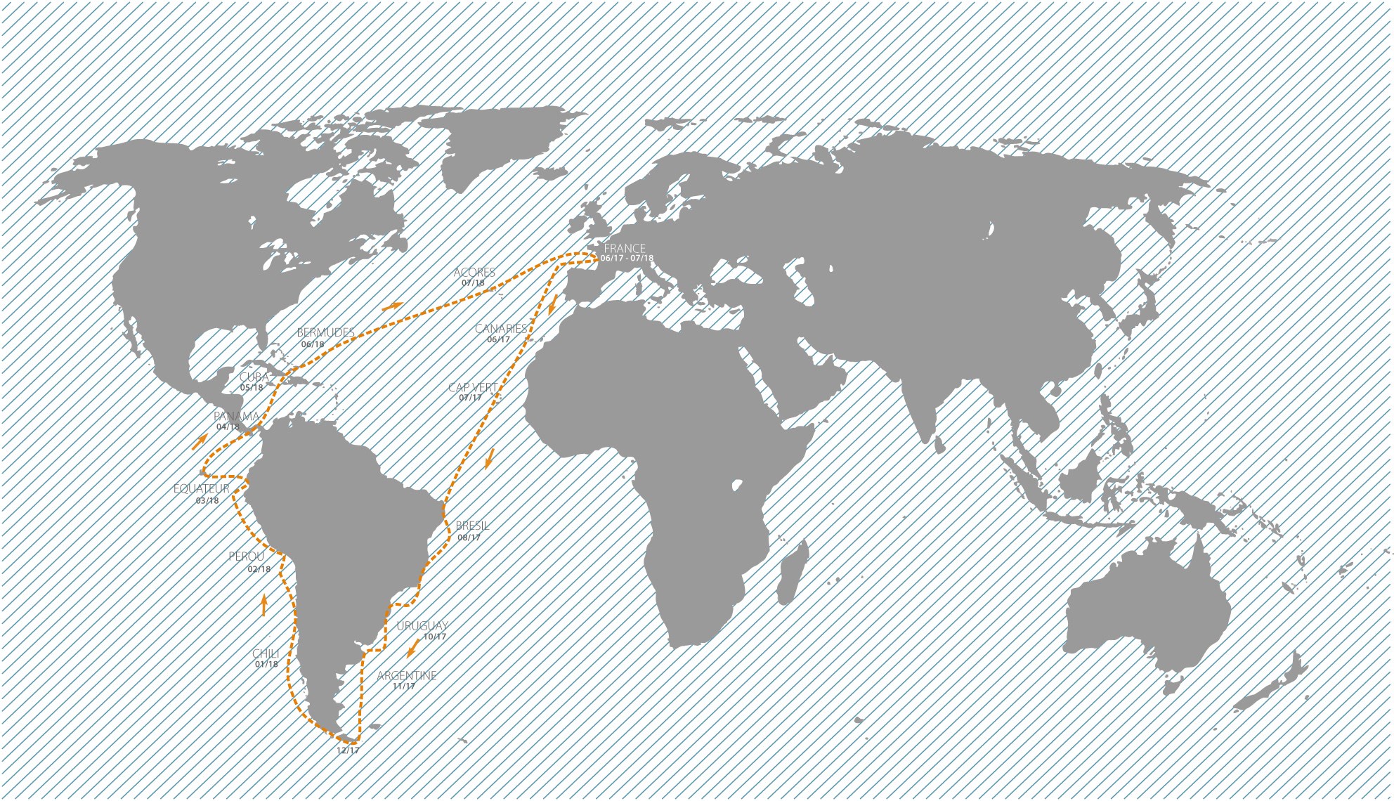 Notre trajet prévoyait un tour de l’Amérique du Sud, au départ et retour de La Rochelle. Commençant par descendre vers les Canaries et le Cap-Vert, nous avons traversé l’Atlantique en juillet 2017 direction le Brésil, évitant ainsi les cyclones, puis nous avons suivi le soleil, descendant vers le sud en même temps que le printemps austral arrivait. Nous étions mi-septembre à Buenos Aires, puis début novembre dans la région du Cap Horn, un peu en avance pour l’été, et avec une météo encore frisquette.